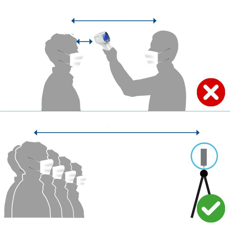 Utiliser un thermomètre frontal manuel pourrait mettre à risque le personnel qui fait les mesures, on ne peut pas faire cette mesure a 2m (distance de sécurité recommandé par les autorités), pour le faire de façon sécuritaire il faudrait le faire comme un professionnel de la santé avec toutes les protections, masques, lunettes, combinaison…